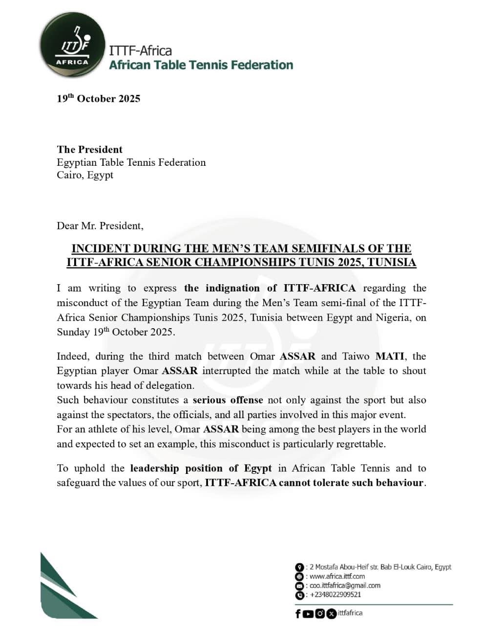 وأوضح الاتحاد، في خطاب رسمي أرسله إلى الاتحاد المصري لتنس الطاولة، أن الحادثة وقعت خلال مباراة نصف النهائي التي جمعت منتخبي مصر ونيجيريا يوم الأحد 19 أكتوبر 2025، عندما قاطع عمر عصر مجريات المباراة أمام النيجيري تايو ماتي وصرخ في وجه رئيس البعثة المصرية.