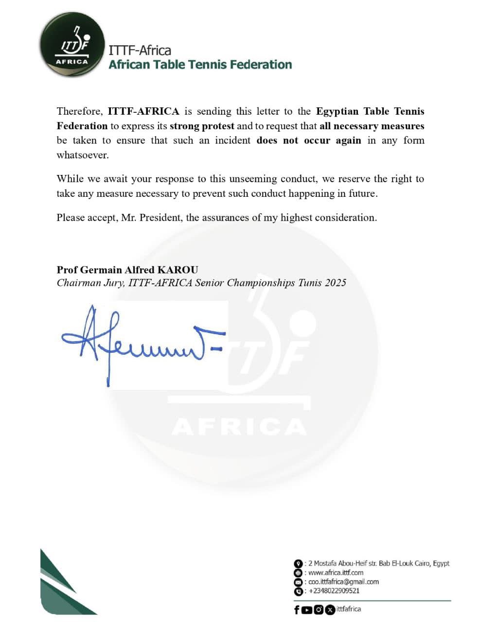واختتم الخطاب بتوقيع البروفيسور جيرمان ألفريد كارو، رئيس لجنة تحكيم بطولة الاتحاد الدولي لتنس الطاولة – أفريقيا للكبار، الذي أكد احتفاظ الاتحاد بحقه في اتخاذ أي إجراء ضروري مستقبلاً لمنع تكرار مثل هذه الحوادث.