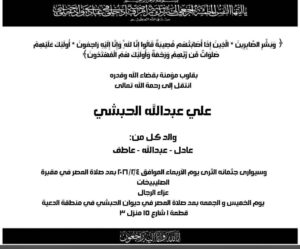 ديوان أبناء المرحوم عبدالرحمن الكندري ينعي العم / علي عبدالله الجبشي
